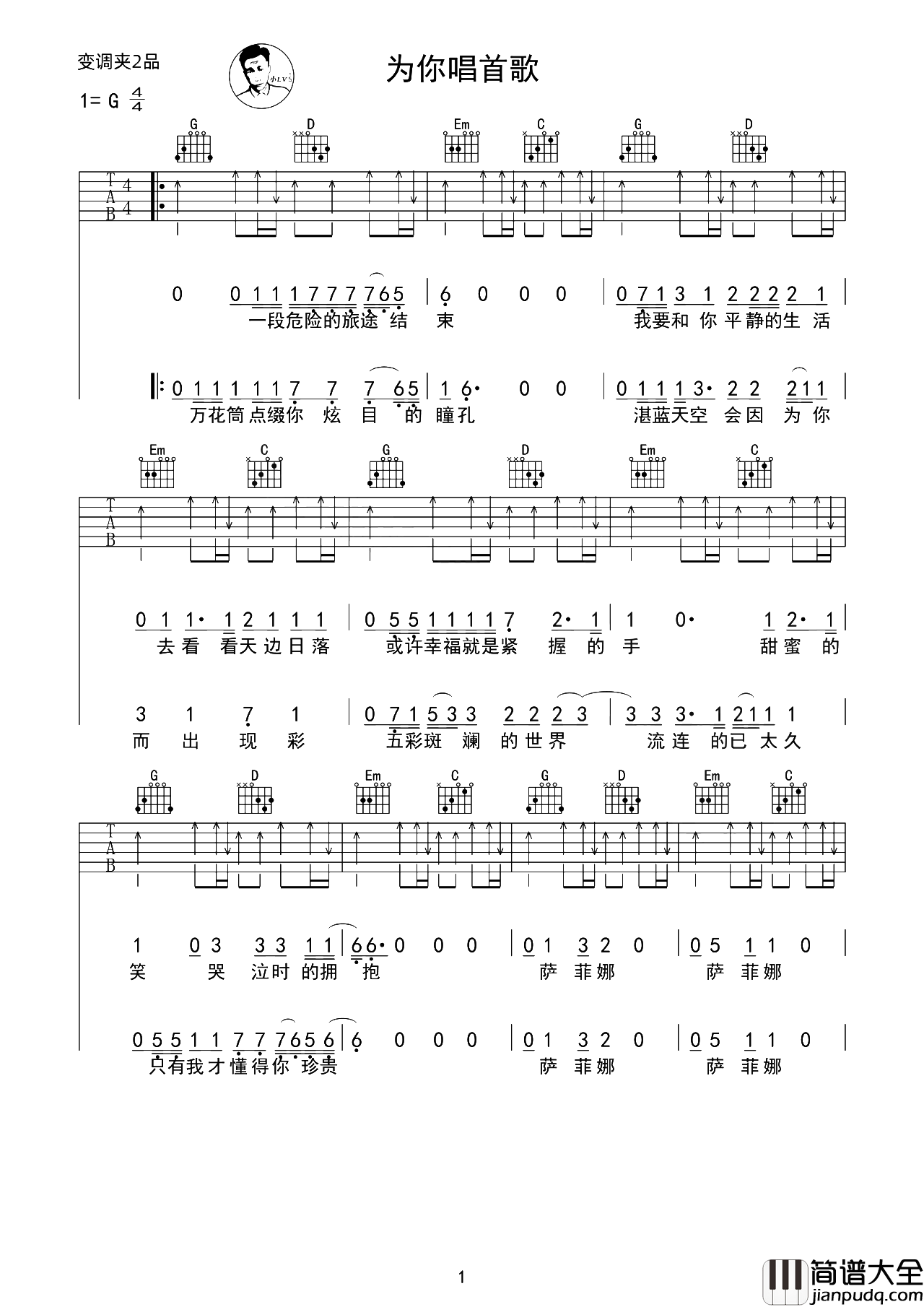痛仰乐队《为你唱首歌》吉他谱,共2张高清PNG六线谱图例,G调指法编配,CAPO夹2品弹回原调A调,全曲扫弦版节奏编配,弹唱难度1/5。