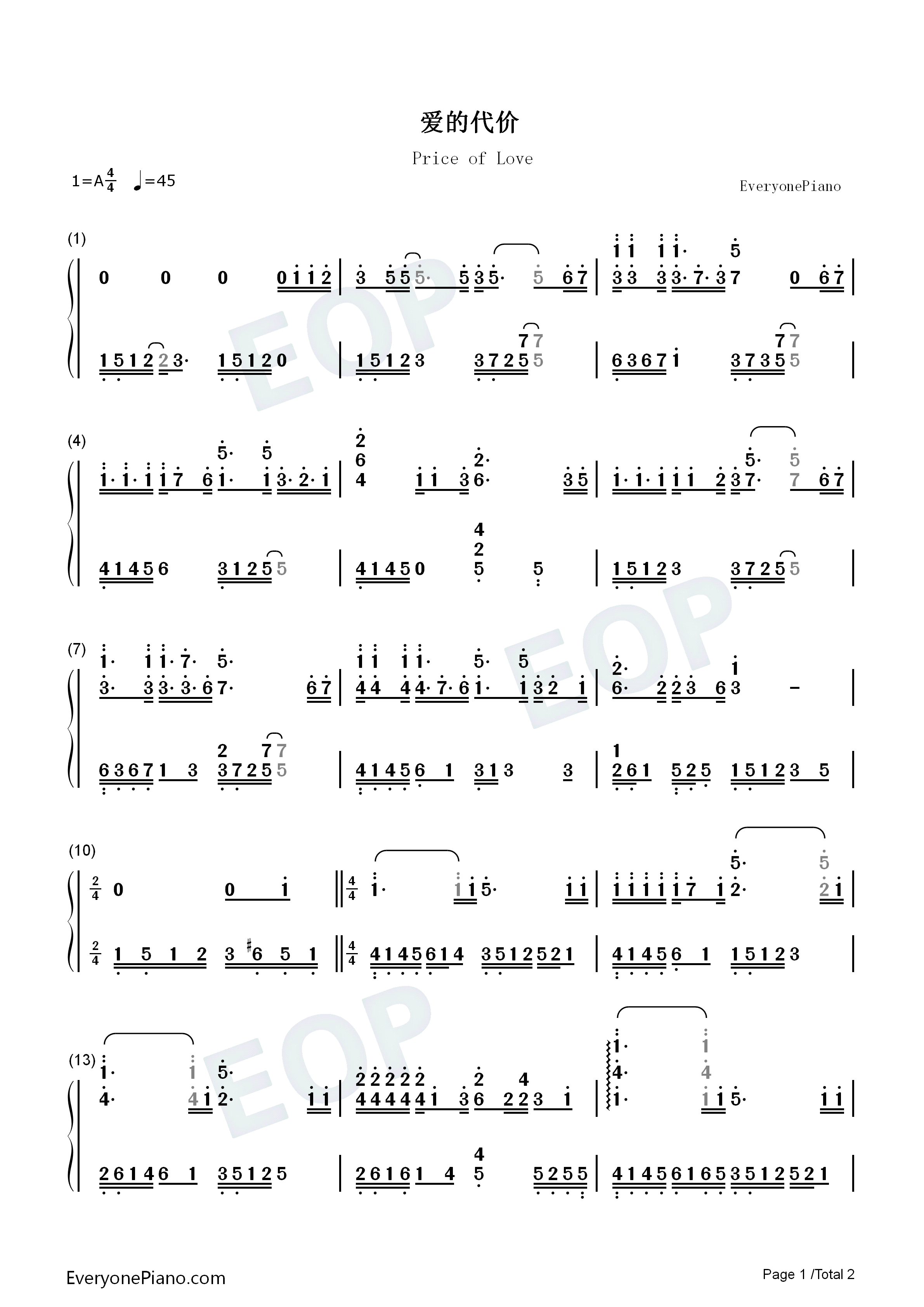- 爱的代价钢琴谱_简单流行版_张艾嘉